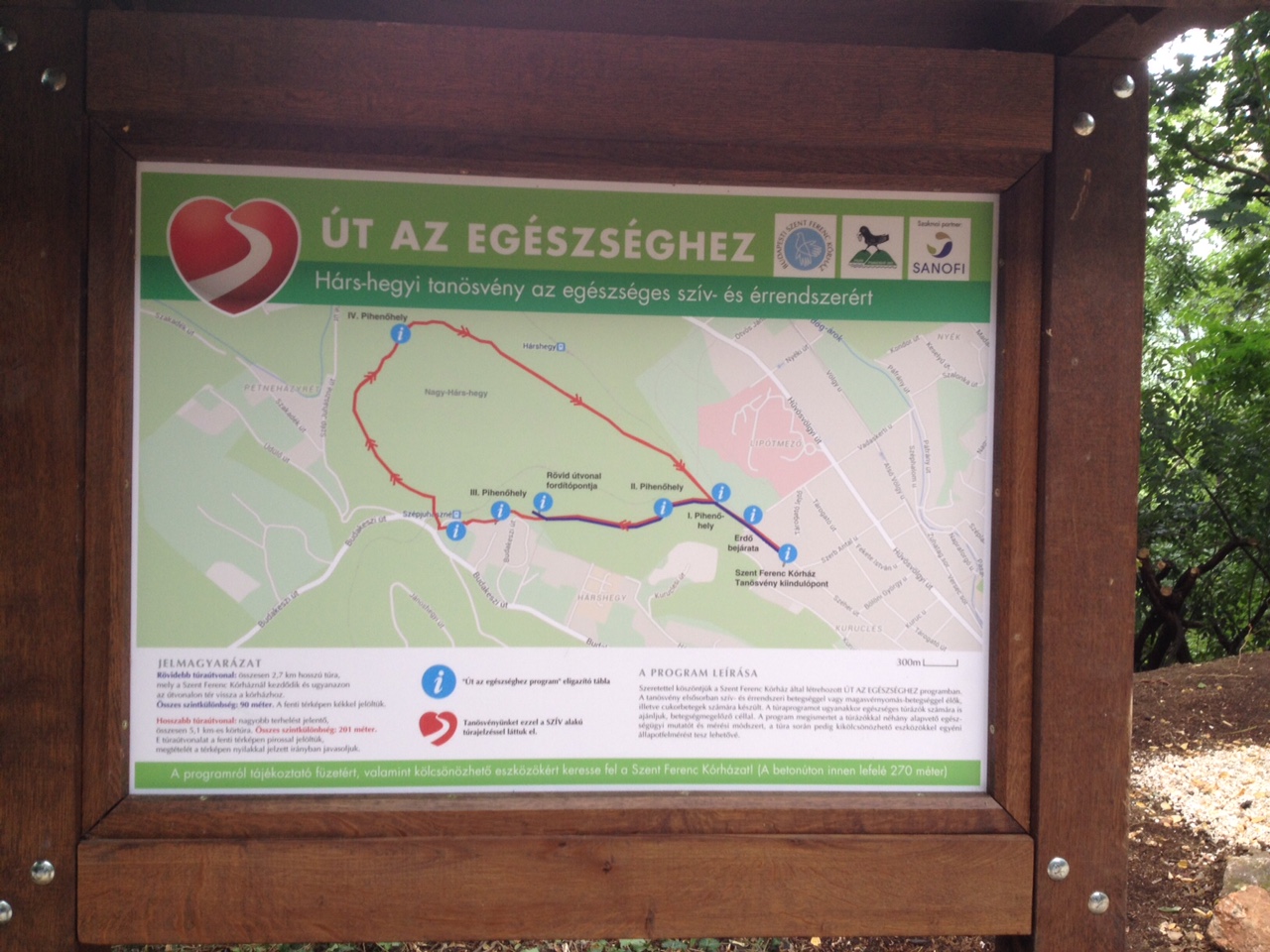 A tanösvénynek saját ? szívet formáló ? túrajelzése van, ez segít a tájékozódásban a rövidebb, 2,7 kilométeres és a hosszabb, 5,1 kilométeres szakaszon egyaránt, a javasolt pulzusmérő pontokat pedig tájékoztató táblák jelzik. Az elmúlt két évben két túraösvényt valósítottunk meg, az egyiket a Szent-Ferenc Kórház közelében lévő Hárs-Hegyen, a másikat pedig Újpesten a Rex Állatsziget melletti Farkaserdőben. Jelenleg zajlik a harmadik ösvény kialakítása Miskolcon. Az eredmények önmagukért beszélnek, eddig közel 10 000 látogatója volt a két ösvénynek, és több mint 60 rizikófaktort vagy betegséget diagnosztizáltak a kórház szakemberei. A befektetés az eredményekhez képest kevés, 2-3 akut infarktusbeteg ellátásának megfelelő összegből kiépíthető és egy éven át működtethető egy-egy tanösvény.